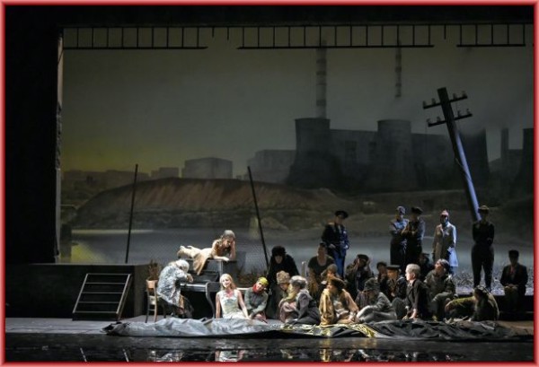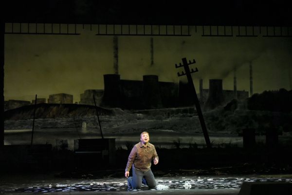 Dazu zählt ein Inszenierungskonzept der längst vergangenen 80er, als man öfter, egal ob Schauspiel oder Oper, sofort alle Personen auf der Bühne drapierte – gleich ob sie jetzt schon auftreten oder erst später. Diese Nichtagierenden sitzen dann meist gelangweilt bis belanglos am Rand herum und zählen imaginäre Fliegen an der Decke oder – was sich in dieser Produktion (Müllplatz hinter der Tschernobyl-Ruine) eher anbieten würde – imaginäre Riesen-Kakalaken auf dem Boden.