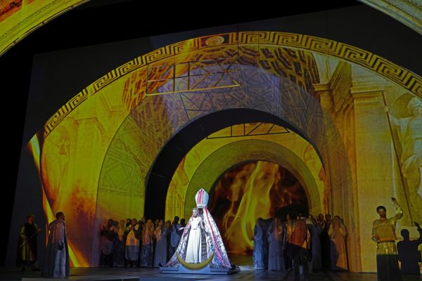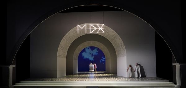 Im zweiten Akt befinden wir uns im Raffaels Fresko „Die Schule von Athen“. Das sieht sehr eindrucksvoll aus, denn die Architektur wird auch als Projektionsfläche genutzt, auf der dann Säulen und Reliefs erscheinen. Der Einzug der Gäste ist aber eine bloße Nachstellung des Freskos durch den Chor ohne jede Regie. Auch sonst hat man den Eindruck, dass Regisseur Dittrich die Figuren nicht als reale Menschen, sondern mehr Ideenträger sieht, sodass die Konstruktion von Bildern wichtiger ist als eine packende Personenführung.