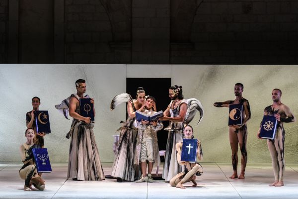 Ebenfalls ausgesprochen gelungen die szenische Umsetzung, die man ursprünglich nicht für unbedingt notwendig gehalten hatte. Doch der Skeptiker war rasch vom Gedankengang des Regisseurs Fabio Ceresa überzeugt, der der Schöpfung der Erde durch Gott parallel die künstlerischen Errungenschaften des Menschen gegenüberstellte, die sich an den sechs Schöpfungstagen als Architektur, Poesie, Musik, Tanz, Malerei und Skulptur erwiesen. Man wurde nicht müde, den fabelhaften Tänzern der Fattoria Vittadini zuzusehen, die die Bedeutung der Musik und der dargestellten Künste wunderbar umsetzten. Die Gruppe besteht aus 8 Tänzern, deren eine, Maria Giulia Serantoni, einen selbst noch lernenden, androgynen Kindgott hinreißend zum Leben erweckte. Für die phantasietrunkene Choreographie kann man Mattia Agatiello nicht genug danken. Im auf das Essentielle reduzierten Bühnenbild von Tiziano Santi steuerten Gianluca Falaschi und Gianmaria Sposito die begeisternden Kostüme bei, Pasquale Mari die faszinierende Beleuchtung. Und ohne Holzhammer wurde eine wichtige Aussage verständlich gemacht, wenn alle Religionen gleichwertig ihren Platz fanden, ebenso wie drei Paare: Er-Sie, Er-Er, Sie-Sie.