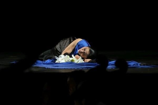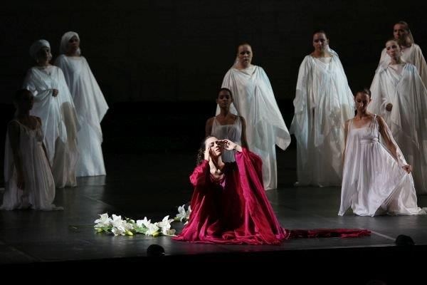 Die von Pier Luigi Pizzi als Regisseur, Bühnen- und Kostümbildner verantwortete Produktion als minimalistisch zu bezeichnen, wäre eine Untertreibung. Es gab nämlich überhaupt kein Bühnenbild, nur die festen Seitenteile der Bühne im Hof des Palazzo Ducale waren schwarz gestrichen, die Fenster des Palastes verhüllt worden (was eine interessante, an Leon Battista Alberti und seinen Goldenen Schnitt erinnernde Wirkung ergab). Die Gewänder bestanden aus vielen Metern besonders leichter Bühnenseide, welchen Stoff Pizzi gewählt hatte, um den im Schlosshof allgegenwärtigen Wind zu nutzen, sodass die Kostüme eindrucksvoll flatterten. Absolut entbehrlich war die Choreographie von Gheorghe Iancu, zunächst, weil sie orchestrale Passagen vertanzte, da keinerlei Ballettmusik vorgesehen ist, und dann wegen einer lächerlichen Gebärdensprache, die aus in schwarz-weißen Gewändern trauernden Figuren geradezu Karikaturen machte.