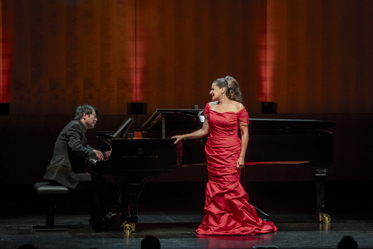 Lang Lang begleitete dieses weibliche Stimmwunder am Flügel. Er, eigentlich der klassische Konzertpianist, betritt ein neues Metier. Schon äußerlich nicht der Klavierbegleiter, den man gewohnt ist, nicht der solistische Star, dem ganze Orchester folgen. Er muss die Lieder und Arien auch von Wort und Thema interpretieren und mit Cecilia Bartoli so eine Einheit sein. Er spielte vollständig auswendig (?) – eine große intellektuelle Leistung. Dabei muss er den Gehalt von Dichtung und Operntext für sich neu erkennen, interpretieren und auf die Tasten umsetzen. Für beide Künstler ein Novum, mit dem sie auf Tournee gehen. In Baden-Baden die Premiere, Hamburg, Dortmund, Köln und Amsterdam werden folgen. Also großes Musiktheater und in allen Fällen ausverkaufte Häuser. Das Festspielhaus trug dem mit einem vergrößerten Platzangebot Rechnung und bestückte Orchestergraben und Bühne mit weiteren Stuhlreihen. Der Flügel verblieb aber in der Mitte der Bühne, Cecilia Bartoli für das dort platzierte Publikum zum Greifen nah und die Auf- und Abgänge mit raschelnder Seide sichtlich genießend.