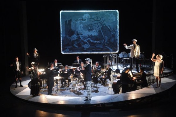 Die Angabe über die Spieldauer des Werks lässt nicht erahnen, welch eine große Zahl von Mitwirkenden das Stück erfordert, so groß, dass sie in dieser Besprechung nur im Kollektiv genannt werden können. Da war zunächst das musikalische Herzstück, ein Ensemble aus Mitgliedern der Berliner Philharmoniker und Stipendiaten der Orchester-Akademie der Berliner Philharmoniker. Das war auf dem Drehteller des Theaters mitten auf der Bühne untergebracht, intonierte einen bissigen Kurt Weill und erzeugte mit mehr als 20 Ensemble-Mitgliedern im Hindemith-Teil einen recht süffigen Klang. Die musikalische Leitung hatte Stanley Dodds inne. Der führte schon im Prolog eine zehnköpfige Trachtenformation des Musikvereins Baden-Lichtenthal mit Holz und viel Blech. Im „Lehrstück“ kam dazu der klangschöne Chor des Collegium Musicum Baden-Baden musikalisch und szenisch zum Einsatz. Das Ensemble bestand aus sechs Sängern (handverlesen unter jungen Absolventen, Stipendiaten der „Akademie Musiktheater heute“ und Preisträgern) sowie acht Schauspielern, teilweise vom Ensemble des Theater Baden-Baden. Ein Bühnenbild wurde nicht benötigt. Auf einem vorderen Spielstreifen zwischen Orchester und Rampe hielt der vom Regisseur die Darsteller in ständiger, auch wuselnder Bewegung. Sie waren von Julia Schnittger in gelungene Kostüme der 20er Jahre gesteckt worden. An den Leistungen der Sänger und Schauspieler gab es nichts, aber auch gar nichts auszusetzen. Und sichtbar machte es denen mehr Spaß als den teilweise ratlosen Zuschauern.