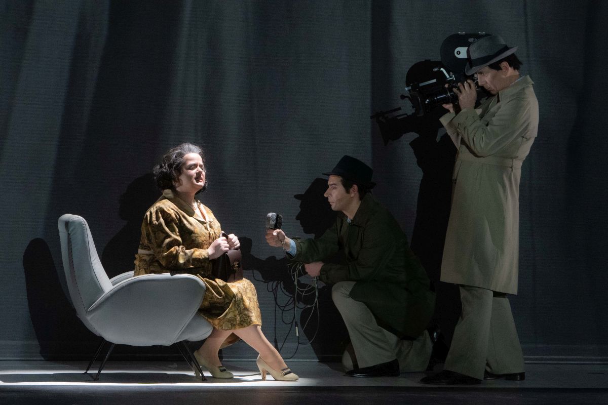 Die musikalische Leitung von Enrico Lombardi folgte am Pult eines nicht näher definierten Orchestra Filarmonica Italiana mit großer Sorgfalt dem musikalischen Geschehen auf der Bühne und verlieh den Zwischenspielen, in denen mir Tramontano ein perfektes Gleichgewicht zwischen Intellekt und Emotion zu erreichen scheint, den nötigen Klangreichtum. Davide Livermore hat mit Koregisseurin Mercedes Martini im geometrischen Bühnenbild von Eleonora Peronetti und den Kostümen von Anna Verde, die den jeweiligen Momenten am Filmset und in der Privatsphäre entsprachen, der Beleuchtung von Aldo Mantovani und den von D-WOK verantworteten Videos der seinerzeitigen Filmaufnahmen und von Artikeln der Tratschpresse eine mit Doubles der beiden Hauptdarsteller bevölkerte Inszenierung geschaffen, die dem Gegenstand und seiner Frage entsprach.