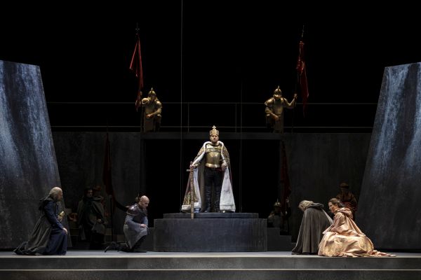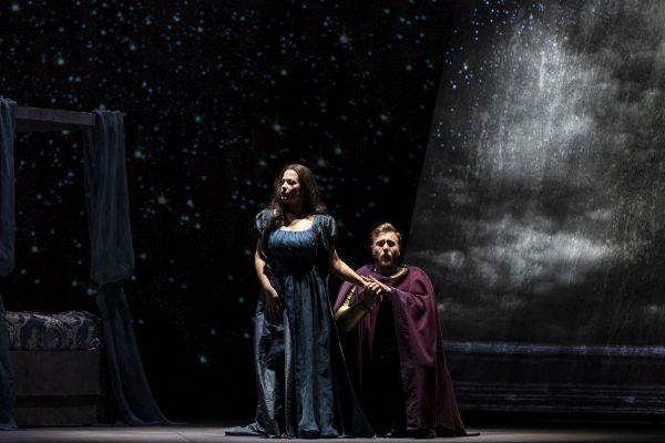 Das von ihm gemeinsam mit Alice Benazzi verantwortete Bühnenbild bestand in erster Linie aus Versatzstücken wie einem Himmelbett, einem Tisch für ein Festmahl oder Blumenschmuck für die Hochzeitsfeierlichkeiten im letzten Akt. Ergänzt wurde es von Videoprojektionen (Luca Attili), und angesichts der pandemischen Lage war der (wieder von Corrado Casati ausgezeichnet einstudierte) Chor des Hauses hinter transparente Vorhänge verbannt, während Figuranten in der Bewegungsregie von Silvia Giordano dessen Aktionen mimten.