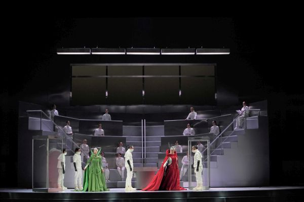 Unter der Voraussetzung, dass eine Regie nicht viel wert ist, wenn man zuvor die Erläuterungen des Regisseurs lesen muss, habe ich mir diese erst nachher angesehen und erfahren, dass die Gefühle der handelnden Personen gleichsam seziert werden sollten und ihnen die Kostüme angelegt wurden, um zu zeigen, in welche Rollen sie gepresst waren und damit ihre Emotionen unterdrücken mussten. Warum sich Cigni plötzlich kopflastigem Regietheater verpflichtet sah, bleibt sein Geheimnis. Für den Zuschauer blieb nur die Feststellung, dass die Szene (Dario Gessati) langweilig und hässlich war und wieder einmal ein Konzept über eine schon im Ursprung konfuse Handlung gestülpt wurde, ohne dass szenisch mit den Sängern gearbeitet worden wäre. So ergab sich schlimmstes Stehtheater, verschärft durch das An- und Ablegen der Kostüme auch während Nummern, auf welche sich Sänger wie Zuschauer gerne störungsfrei konzentriert hätten.