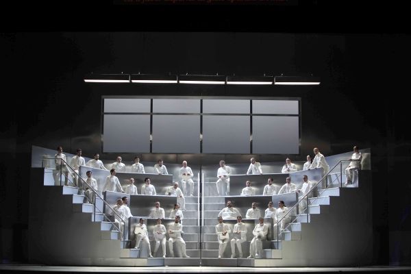 Der Regisseur Andrea Cigni war bisher in Italiens gehobener Provinz als verlässlicher Handwerker, dem auch gute Einfälle nicht fehlten, bekannt. Und nun das! Donizettis Belcantodrama spielte sich in einem – Anatomiehörsaal ab. Die bemitleidenswerten Sänger wurden wie für eine Autopsie auf einer Liege hereingeschoben; zum Glück schreckte Cigni davor zurück, sie nackt zu zeigen und hatte sie in weiße Tücher gehüllt. Der die Studenten verkörpernde Chor (nicht ganz so sattelfest wie gewohnt) zeigte je nach Szene in einzeln auf Zettel geschriebenen Wörtern wie „Pflicht“, „Liebe“, „Ablehnung“ und Ähnlichem seinen Kommentar. In großen, jeweils mit dem Rollennamen beschrifteten Glaskästen wurden die Kostüme hereingeholt und die Sänger mit Fortschreiten der Handlung damit bekleidet. Der Hörsaal wurde einige Male so verschoben, dass sich eine graue Wand zeigte, vor der sich das Geschehen abspielte. (An die von Alfonso besungenen, prachtvollen Gärten des Alcazar darf man da freilich nicht denken…).