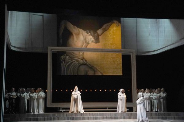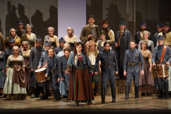Wo das Geld knapp ist, regiert die Phantasie, und so ließ sich Regisseur Italo Nunziata von dem in Italien lebenden finnischen Künstler Hannu Palosuo Gemälde entwerfen, die im Hintergrund die jeweilige Szene kennzeichneten, wie etwa eine A rt Luster für das erste Bild und Kreuzigungsansichten für die Klosterszenen. Wo es keine Gemälde gab, genügte ein schlichtes Kreuz von Bühnenbildner Emanuele Sinisi, der auch zeigte, wie vielfältig ein langer Tisch eingesetzt werden kann, diente er doch nicht nur als Schreibtisch im 1. Bild, sondern wurde auf ihm das Essen in der Schenke aufgetragen, der verletzte Alvaro auf ihn gebettet oder er stand Preziosilla für ihre Aufrufe und Melitone für die Essensausgabe zur Verfügung. Sonst genügten ein paar Stühle und Sandsäcke – et voilà! Nicht immer so geglückt waren die Kostüme von Simona Morresi: Die Militärjacke des korpulenten Don Carlo mit einem Gürtel in Form eines schmalen Bandes zusammenzuhalten, war keine gute Idee, ebenso wie sein bürgerliches Outfit beim großen Duett im vorletzten Bild. Und schön anzuschauen, aber eben allzu schön waren die Kostüme des Damenchors, wenn vazierendes oder bettelndes Volk darzustellen war. Der Rest ging in Ordnung, wie auch die Regie von Nunziata, der die Massen geschickt bewegte, die Sänger singen ließ und ein paar gute Ideen hatte, wie etwa den Diebstahl von kirchlichen Paramenten und Kerzenleuchtern seitens der Soldateska, die Melitone bei seiner Predigt wütend wieder an sich riss. Zur Ballettmusik tanzte Preziosilla mit Soldaten, was wesentlich natürlicher wirkte als die üblichen Balletteinlagen. Die Verlegung der Handlung in die zweite Hälfte des 19. Jahrhunderts hatte weiter keine Auswirkungen.