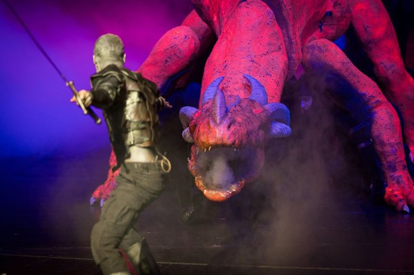 Dabei gibt es konzeptionell einige Änderungen zu Wagners „Ring“. Da sind statt der Rheintöchter die sicher artverwandten „Rheinamazonen“, die sich bedeutungsschwanger „Zärtlichkeit“, „Lust“ und „Schmerz“ nennen, es aber damit nicht ganz genau nehmen. Nachdem der „Ring“ bei Wotan gelandet ist, schafft Alberich, dem hier zudem noch mit dem Star Chris Murray eine viel stärkere Rolle zukommt als gewohnt, in seiner Schmiede einen Edelmenschen aus Eisen und Stahl, den jungen Siegfried. Dieser steigt, nachdem er den Ring vom Drachen gewonnen und Wotan entmachtet hat, zum Alleinherrscher der Menschheit auf. Nun versucht Wotan seine Tochter Brunhild zum Mord an ihrem geliebten Siegfried zu überreden, was auch Alberich versucht, aber Brunhild kann ihn retten und bringt nun ihrerseits ihren Vater Wotan um! Ungewohnte Kost… phantasievoll ist allerdings der Drache gestaltet, ein Ensemble aus Tänzern macht ihn zur beweglichen Gefahr – mit einem humoristischen Augenzwinkern. Die Rheinamazonen lassen sich bisweilen zu allzu albernen Aktionen hinreißen. Die Tänzer vollziehen ein engagiertes Wasserballett im Riesenpool des Festspielhauses, der einst für des Königs finalen Gang bei Berg in den Starnberger See gebaut wurde. Immerhin bekommen die Rheinamazonen am Ende von Brunhild den Ring zurück.