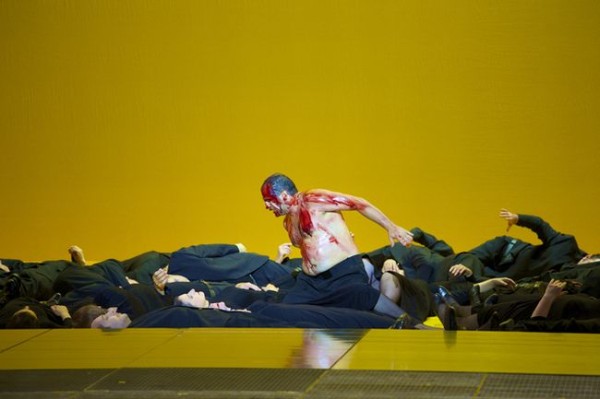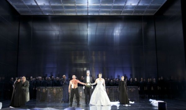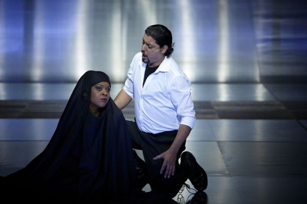 Diese ein wenig an Neuenfels’ Bayreuther Deutung von Wagners Heinrich der Vogler erinnernde Sicht des Regisseurs macht aus dem König eine regelrechte Abziehfigur, eine Karikatur ersten Grades, die nicht ernst zu nehmen ist. Er lehnt es ab, selbst aktiv zu werden und beobachtet das Geschehen lieber von seiner übergeordneten Warte bzw. von der Seite aus. Er ist nurmehr eine Marionette in der Hand des im schicken dunkelblauen Anzug mit Hemd und Krawatte auftretenden Ramphis, dem seine Sonnenbrille einen mafiösen Anstrich verleiht. Der Pate hat sich nach Ägypten verirrt. Gekonnt wird von Fisher hier eine ganz und gar weltlich orientierte politische Priesterschaft vorgeführt, dessen Anführer als spiritus rector die Fäden sicher in der Hand hält und am Ende den Pharao mit einer ursprünglich Radames gehörenden Kalaschnikow kurzerhand liquidiert. Hier wird vom Regisseur treffend das Problem einer anrüchigen Staatskirche aufgeworfen, die gerne auch mal Vetternwirtschaft treibt. Jedenfalls erscheint die Berufung von Radames zum Heerführer als abgekartetes Spiel zwischen Ramphis und Amneris, in dem deren Vertrauten Thermouthis, die auch in naher Beziehung zu dem grausamen Oberpriester steht, eine Schlüsselrolle zukommt. Ihr Gewand weist sie als Landsmännin von Aida aus, die sich im Gegensatz zu dieser mit dem fragwürdigen ägyptischen Staatssystem bestens arrangiert hat und ihm nun bereitwillig dient. Am eindrucksvollsten ist Fischer die Gerichtsszene gelungen. Die Bühnentiefe reicht bis zur hinteren Brandschutzwand, vor der die Priester auf Stühlen nebeneinander sitzen, etwas weiter vorne rechts Ramphis. Vorne, abgesondert, allein und mit dem Rücken zum Auditorium steht Radames, dem die mit dem Mut der Verzweiflung gegen die Priester aufbegehrende Amneris nicht mehr helfen kann – ein ungeheuer unter die Haut gehendes Bild. Radames und Aida sterben am Ende einen symbolischen Tod: Eine über ihnen befindliche Brücke senkt sich immer mehr auf sie herab und begräbt sie zu guter Letzt unter sich. Das alles war hervorragend durchacht und bravourös umgesetzt.
