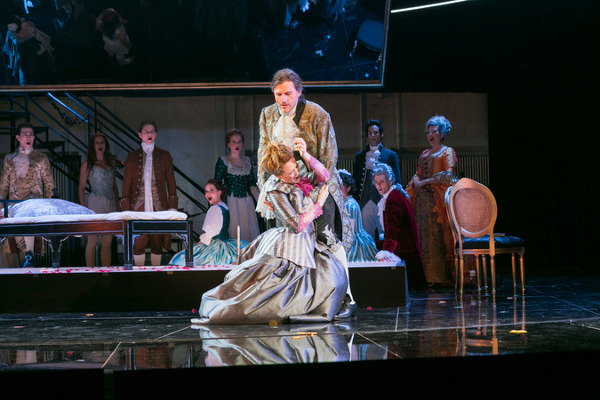 Gerade an dieser wichtigen Partie kann man die Dignität dieser Musical-Produktion festmachen, denn im Grunde handelt es sich um ein durchkomponiertes Schauspiel mit opernhaft durchwürzter Musical-Tönung. Als solches aber funktioniert es „nur“, weil alles zusammenstimmt: der Sound, das Drama, die Dialoge, die – pardon – Höhepunkte, die Chorszenen, die Bilder. Nein, man braucht hier keine üppige Pseudo-Rokoko-Ausstattung. Es genügen: eine Brücke mit Rokoko-Bändern, eine fleißig in Einsatz gebrachte Drehbühne, sehr schnelle Wechsel zwischen den Szenen, ein Tisch, manchmal ein Cembalo und, für Cécile de Volanges‘ Musikstunden, eine Harfe – und ein Deckenspiegel, der uns eine Perspektive auf die Bühne gibt, die die Möglichkeiten der Spiegelung wunderbar nutzt.