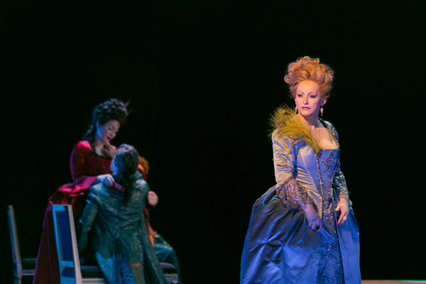 Über den Cast ist insgesamt nur eines zu sagen: das Stück wurde perfekt besetzt – von den Hauptrollen über die beiden mittleren weiblichen Partien bis zu den „kleinen“ Rollen. Carin Filipčić ist eine durchaus charismatische Madame de Volanges: eine souveräne Dame der Gesellschaft, bei der nicht nur die Perücke gut sitzt (ein Superlob für die Direktion Kostüm/Maske: Inge Schäffner, auch für den Kostümgestalter Alfred Mayerhofer). Gisela Ehrensperger ist die alte Madame de Rosemonde, die Vertraute der Madame de Volanges, die gar nicht viel tun muss, um zu wirken. Das Ensemble der Damen und Huren (unter ihnen Nazide Aylin als Émile, die Cécile zusammen mit dem Vicomte in die Freuden eines flotten Dreiers einweiht), der wenigen Herren und vielen Kammerdiener (unter ihnen Erwin Windegger als Azolan, Valmontes Diener) und Zofen, wird – gleichsam als weibliches wie aggressives Gegengewicht zur „schwachen“ Madame de Tourvel – dominiert von Anna Montanaro alias Marquise de Merteuil. „Liebe macht uns schwach“, so singt sie in einer wahrhaft „großen Arie“ ihre Philosophie stimmstark und beifalllprovozierend heraus.