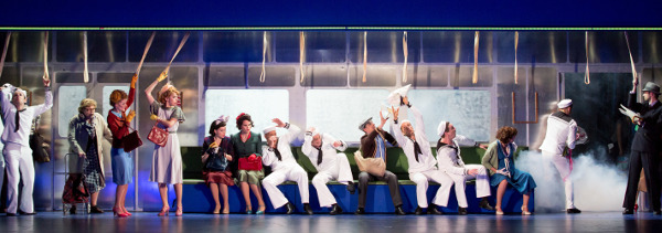Und wenn gleichzeitig acht Paare sich zärtlich in ihren Pas de deux‘ wiegen, kapieren wir, dass das Unterhaltungsstück doch ein wenig mehr ist als eine triviale, zeitbezogene Story von 1944, die die Zuschauer von den Sorgen des Krieges ablenken sollte. Der Regisseur Josef E. Köpplinger, der manchmal – vielleicht ein bisschen zu laut und zu chaotisch, aber so mögen sie sein: die besoffenen Matrosen auf Landgang -, auf Anflüge von Klamauk setzt, aber sonst die Waage zwischen Komödie und Gefühl gut hält, der Regisseur also hat mit einer einzigen Figur und ein paar zeitgenössischen Schwarzweißfilmen etwas Zeitloses in die Inszenierung gebracht: So, wie am Ende sich der wunderbar euphorische Song und Schlager des Musicals, „New York, New York“, mit dem nächsten Landgang der nächsten Matrosen wiederholt, so begegnet wieder die Figur der jungen Frau, die, mit dem Foto ihres Liebsten in der Hand, die neuankommenden Matrosen nach dessen Verbleib fragt.