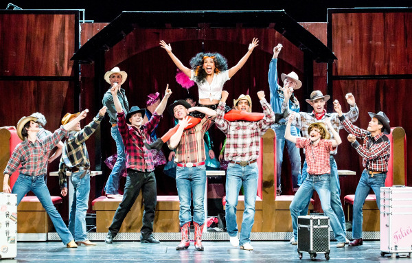 Damit reiht sich „Priscilla“ in die lange Reihe jener populären Opern ein, die als Pasticcios seit jeher zusammengestoppelt wurden. Zum Gelingen des Abends trägt das kleine und sehr feine Orchester unter der Leitung Jeff Frohners bei, auch die Choreographien Melissa Kings, die mit einem Coup de theatre den Abend einläutet: Zu Paul Shaffers „It’s raining men“ schweben, das gibt den ersten Szenenbeifall, sieben Jungs vor den drei Diven mit den herrlichen Riesenflügeln von sehr weit oben auf die Bühne, bevor sie sich entblättern und „Miss Verständnis“ (Eric Rentmeister), versehen mit einem echt burlesquen Kopfaufbau, in die Welt des „Cockatoo“-Clubs einführt. Zwischendurch gibt’s „Les Girls“ zu sehen, eine gemischte Truppe, zu der Bernadette einst gehörte (und woran sich Bill noch nach Jahrzehnten erinnert), sehr stilvoll, sehr schick, zu der, auch dies eher nostalgisch als 80er Jahre, Jerome Kerns „A fine romance“ angestimmt wird. Grandios auch die Casinoshow der drei „Ladies“, die wir, pardon, nur von hinten und im Schnelldurchlauf mit blitzschnellen Umzügen sehen: ein einfacher, aber wirksamer Vertauschungstrick. Schließlich aber tanzen die drei Herren als Damen den vorerst letzten Tanz auf dem Ayers Rock. Das Publikum ist aus dem Häuschen und erklatscht sich eine Zugabe. „Mehr Spaß geht nicht“, titelte eine Münchner Zeitung. Der Abend hat auch ernste Aspekte, aber im Grunde stimmt’s: selbst wenn man nicht während einer Countrydancenummer auf die Bühne gebeten wird.
