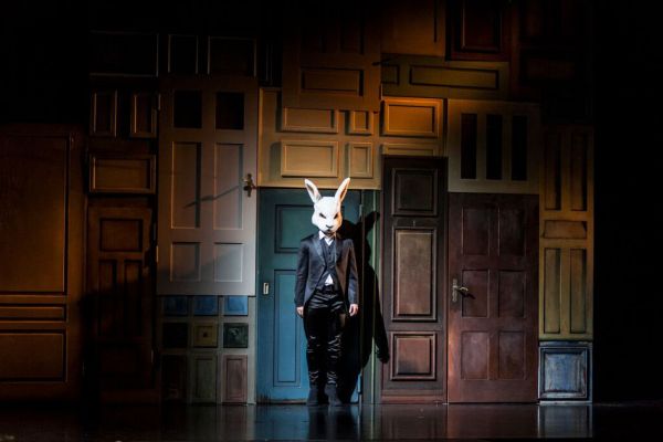Das zentrale Bühnenbild besteht aus rund dreißig Türen, die über eine schon fast bedrohlich wirkende große Rückwand auch mal verquert oder sich drehend präsentieren. Alle lassen sich öffnen und bergen je nach Szene, wie ein Adventskalender-Türchen, zauberhaft Skurriles. Bühnenbildnerin Britta Tönne hat die Szenerie ganz und unmittelbar ins das Gestühl des wandlungsfähigen Kleinen Hauses integriert; man sitzt hautnah dicht am Geschehen und manchmal wird der Zuschauer auch direkt einbezogen.