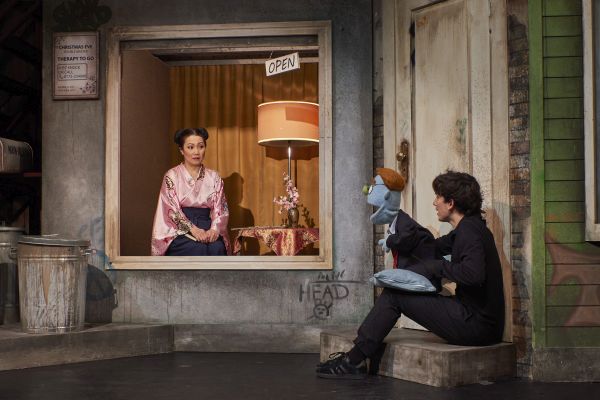 Nachdem am Musiktheater im Revier derzeit nach wie vor nicht gespielt werden kann, entschied man sich dazu, das Musical „Avenue Q“ als vollwertige Produktion im Stream anzubieten. Die Tickets für zwei unterhaltsame Stunden kosten 15 Euro, ermäßigt 10 Euro sowie als Unterstützerticket 25 Euro. Doch Vorsicht, auch wenn die Puppen, die den besonderen Charme dieser Produktion ausmachen, sehr niedlich aussehen, sollten die Kinder rechtzeitig vor Beginn des Streams im Bett verschwunden sein. Die Avenue Q befindet sich am Rande von Manhattan, symbolisch für die Bewohner, die ebenfalls eher am Rande der Gesellschaft zu finden sind. Und doch stehen sie alle mitten im Leben mit ihren zahlreichen Problemen. Sei es die drohende Arbeitslosigkeit nach dem erfolgreichen Schulabschluss, die Angst vor dem Coming-Out als Homosexueller oder die Verzweiflung einer netten jungen Dame darüber, niemals den passenden Mann fürs Leben zu finden. Angelehnt an die Sesamstraße sind die Bewohner der Avenue Q weitestgehend Puppen, wie z. B. die Kindergärtnerin Kate Monster, die von Ihrer Monsterschule träumt oder Princeton, der frisch von der Highschool nach der Bestimmung seines Lebens sucht. Die Wohngemeinschaft aus Nicky und Rod erinnert sicher nicht ohne Absicht an die allseits bekannten Ernie und Bert und Trekkie Monster (nicht verwandt oder verschwägert mit Kate) konsumiert statt Kekse lieber andere Dinge im Überfluss. Aber auch Brian und seine zukünftige Gattin Christmas Eve, eine Therapeutin mit japanischem Migrationshintergrund bewohnen als „echte Menschen“ das Haus in der Avenue. Und dann wohnt hier auch noch Macaulay Culkinn, einst ein Kinderstar in „Kevin allein zu Haus“, inzwischen aber nach mehreren persönlichen Problemen fast vergessen. In der Avenue Q arbeite er nun als Hausmeister, um sein Geld zu verdienen.