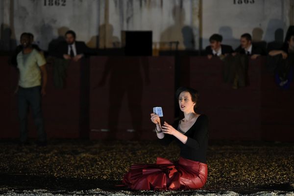 In der aktuellen Theaterzeitung des MiR heißt es zum Ansatz der Regie: "Die Regisseurin erzählt ein Gesellschaftsdrama, in dem sowohl der Außenseiter Don José als auch die Außenseiterin Carmen in der Komplexität ihrer Entscheidungen beleuchtet werden." Leider gelingt dies aber nicht wirklich, denn die Personenführung ist teilweise nur schwer zugänglich und man hat fast den Eindruck, als wollte man hier zu viel erreichen und hat dabei die grundlegenden Dinge einfach komplett übersehen. In der Inszenierung von Rahel Thiel werden die Beziehungen der Figuren untereinander maximal ansatzweise deutlich. Dies ist sehr schade, wäre bei einer bekannten Oper wie "Carmen" aber noch verschmerzlich, wenn der Rest der Inszenierung stimmig wäre. Schließlich haben die meisten Besucher vermutlich zuvor bereits eine Carmen-Vorstellung besucht. Allerdings wollte man mit dieser Produktion in Gelsenkirchen eigentlich auf ein wichtiges und ernstes Thema wie den Femizid aufmerksam machen. Hierbei geht es um die Tötung der Partnerin oder der Ex-Partnerin, bei der die emotionale Notlage auch vor Gericht immer wieder als mildernder Umstand bewertet wurde. Hätte man dies nicht in der bereits erwähnten Theaterzeitung oder der Einführung zum Stück erfahren, dann muss man wohl eingestehen, dass dieser besondere Aspekt dem nicht informierten Zuschauer weitestgehend verborgen bleiben dürfte. Verborgen bleibt dem Zuschauer auch der Sinn, warum am Ende des ersten Aktes ausgerechnet Don Josés Vorgesetzter Zuniga Carmen endgültig aus der Gefangenschaft befreit und gleichzeitig wie in der Oper vorgegeben Don José hierfür bestraft. Immer wieder kann man über die Personenführung nur den Kopf schütteln, fast wirkt es so, als hätte man diesen Aspekt für ein paar große Bilder schlichtweg geopfert. Dass die Soldaten die eintreffende Micaela auch körperlich bedrängen ist noch nachvollziehbar, im nächsten Moment reagieren dann aber alle Personen völlig realitätsfremd, so dass man sich immer wieder fragt, was das soll? Zudem verfallen die Darsteller nach einzelnen Szenen immer wieder in Gelächter, was der Sache auch nicht unbedingt dienlich ist. Dennoch gibt es auch ein paar Lichtblicke. So ist es beispielsweise durchaus stimmig, wie Carmen an verschiedenen Stellen immer wieder die Stierhörner aufgesetzt werden. Zudem scheint es immer wieder so zu sein, als würde Carmen durch die stets vorhandene Menschenmenge nicht nur genau beobachtet, sondern auch stark beeinflusst. Sehr gut gelöst ist auch der vierte Akt, in dem das Aufeinandertreffen von Carmen und Don José in die Stierkampfarena verlegt wird und das direktes Aufeinandertreffen in Form des Stierkampfes inszeniert wird. Das Publikum auf den Rängen schaut sich dieses Treiben durchaus amüsiert an. Als Carmen schließlich durch die Messerstiche von Don José ums Leben kommt, wird aus dem Schnürboden ein erstochener Stier herabgelassen.