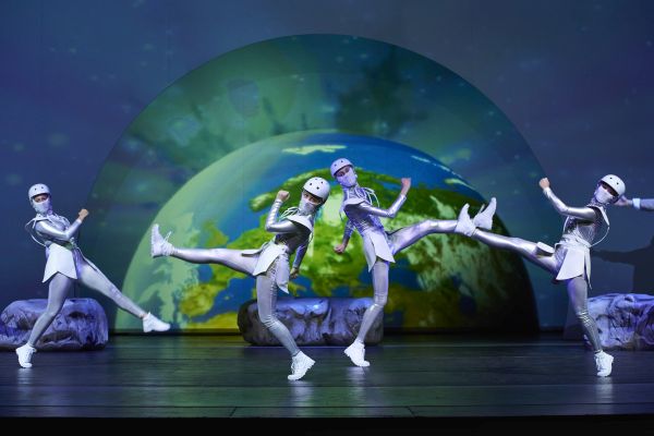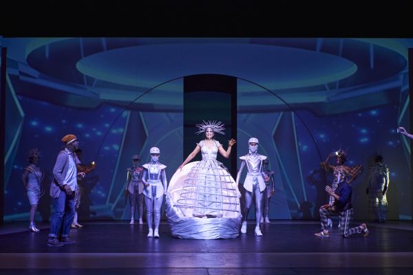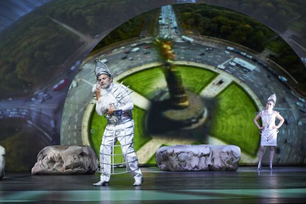 Kommen wir an dieser Stelle nun doch noch einmal kurz auf die notwendigen pandemiebegründeten Umstellungen der Inszenierung. Leider darf derzeit kein Opernchor auf der Bühne auftreten. Daher wurden die Mitglieder des Opernchores virtuell der Mondparty von Frau Luna zugeschaltet, was durch Videoeinspielungen passend in die Inszenierung eingebaut wurde. Lediglich Frau Venus und Herr Mars waren live bei Frau Lunas zu Gast, letzter war aber doch sehr damit beschäftigt den passenden Schnappschuss von sich selbst zu machen. Auch die notwendigen Abstandsregelungen wurden gut in die Inszenierung übernommen, so dass man, wenn man als Zuschauer nicht drauf achten würde, oder an der ein oder anderen Stelle nochmal bewusst drauf gestoßen würde, dies wahrscheinlich gar nicht bemerken würde. Gesungen wird mit Plastikmasken vor dem Gesicht, was hin und wieder durch die Scheinwerfer kurz mal spiegeln kann, ansonsten aber ebenfalls nicht weiter stört. Erstaunlich gut klappte bei der besuchten Vorstellung auch die Abmischung von Musik, Gesang durch Mikroports und Einspielung des Chores vom Band. Den eigenen Humor der Inszenierung im Bezug auf den Corona-Virus hatte ich ja bereits zuvor erwähnt.