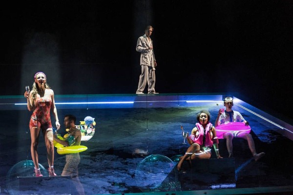 Der nach hinten ansteigende Rahmen wirkt wie eine Wasserfläche, auf der grüne Algen schwimmen, aus denen die Sängerinnen immer wieder auftauchen. Haben sie größere Szenen so sitzen oder stehen sie auf Podesten, so dass sie in unterschiedlicher Höhe aus der Laser-Wasser herausragen. Mehr Bewegung ist dann aber nicht möglich. Originell ist auch die Idee mit den VR-Brillen: Wenn auf der Leinwand über der Bühne das Gesicht einer Figur erscheint, weiß der Zuschaue, dass er jetzt mit Hilfe der VR-Brillen nachschauen kann, was im Kopf dieser Figur vorgeht. Das Team aus Daniel Wolf und Max Friedrich erschafft fantastische 360-Grad-Bilderwelten, in denen die Figuren von Liebesglück träumen oder Todesängste ausstehen. Nutzt man die VR-Brille, sieht man aber nicht mehr, was auf der Bühne passiert. Einfacher wäre es gewesen, diese Filme über die Leinwand in das Geschehen zu integrieren. Da der Einsatz von VR-Brillen in der Oper noch am Anfang steht, wird dieser Bereich in den nächsten Jahren bestimmt eine spannende Entwicklung durchmachen.