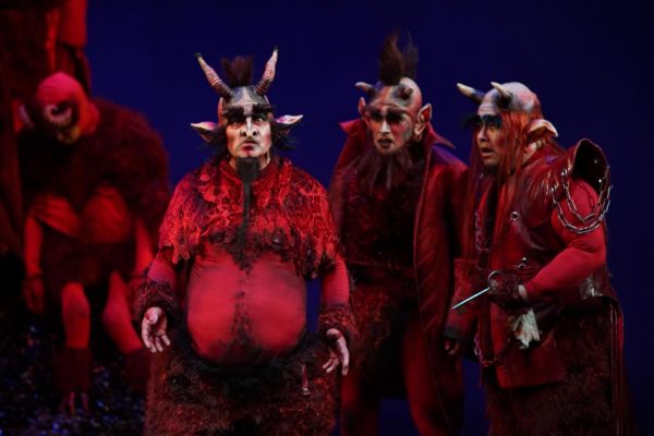 Last but not least hat Joa chim G. Maaß (Bild oben – für den nicht benannten Maskenbildner ein zusätzlicher Opernfreund-Stern) der Oldstar des MiR – oder soll ich besser sagen die totale Rampensau – mal wieder einen Glanzabend in der Partie des Teufels. Was für ein Charaktersänger! Ich kenne ihn nun schon Jahrzehnte und er war immer grandios. Bei ihm hat sogar die anfängliche generelle Ansage über die Bitte-Nicht-Verwendung-des-Handys während der Vorstellung noch augenzwinkernden Humor. Natürlich halten sich diverse oft jugendliche Pappnasen nicht daran, die sogar während der Vorstellung ihre Erfahrung per SMS weitergeben. Na, Hauptsache keine Fotos, damit das Copyright nicht verletzt wird.