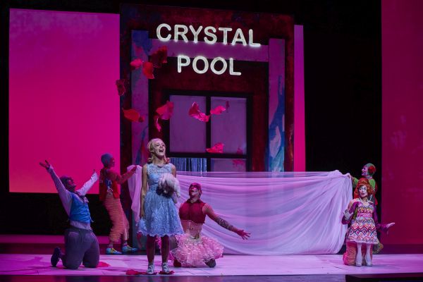 Wie erwähnt bietet das Musical einige wunderbare Nummer, wie „Come on along with the Black Rider“ welches schnell im Ohr hängenbleibt oder die wunderschöne Ballade „The Briar and the Rose“ welche in Gelsenkirchen von Sebastian Schiller als Wilhelm und Annika Firley als Käthchen ganz wunderbar dargeboten wird. Immer wieder fährt Joachim G. Maaß mit dem Fahrrad über die Bühne und lässt warnende aber nicht immer nachvollziehbare Worte erklingen. Ansonsten setzt die Inszenierung von Astrid Griesbach stark auf das Puppentheater, welchem am Musiktheater am Revier seit einiger Zeit große Aufmerksamkeit geschenkt wird. Der Teufel wird durch einen Holzkopf mit großen Hörnern und leuchtend roten Augen dargestellt. Bei den Eltern von Käthchen setzt man dagegen auf den echten Kopf der Puppenspieler, der in einen Puppenkörper mit kurzen Armen und Beinen übergeht und von den Darstellern daher meist kniend gespielt werden muss. Dies funktioniert ganz hervorragend und das „Devil Team“ bestehend aus Daniel Jeroma, Merten Schroedter, Gloria Iberl-Thieme, Seth Tietze und Marharyta Pshenitsyna leisten hier ganze Arbeit, was immer wieder zu sehr komischen und unterhaltsamen Szenen führt. Auch die Ansiedlung der Handlung auf einem Jahrmarkt kann gefallen, klingen einige Lieder ja in der Tat nach einer Art Jahrmarktsmusik. Heribert Feckler leitet die Mitglieder der Neuen Philharmonie Westfalen gewohnt souverän durch die rund 120 Minuten, die mit einer Pause nach rund 55 Minuten aufgeführt werden. Immer wieder werden skurrile und groteske Ideen eingestreut, beispielhaft genannt seien hier massenhaft herabfallende Plüschtiere, die wie Preise in der Schießbude von Wilhelm geschossen wurden. Alles in allem ist „The Black Rider“ in Gelsenkirchen nicht zuletzt wegen der interessanten Regie, der Leistung der Darsteller und Musiker sowie der Puppen und Kostüme von Atif Mohammed Nor Hussein dann doch ein ganz unterhaltsamer Abend, der es aber leider auch nicht schafft mich komplett mit dem Werk an sich zu versöhnen. Das Premierenpublikum spendete langanhaltenden Applaus für alle Beteiligten.