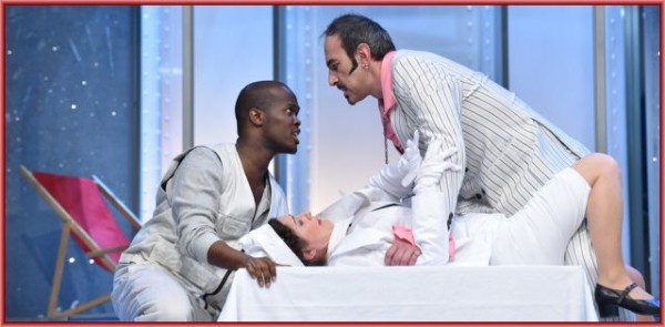 Das schöne Gerhart Hauptmann Theater der Görlitzer wirkt von außen größer, als es der Opern / Theatersaal ist, und das kommt vor allem Nemorino zugute. Denn der farbige Südafrikaner Thembi Nkosi hat (abgesehen davon, dass er so drollig wirkt, wie es der Rolle wohl ansteht) einen wirklich schön timbrierten, leichten Tenor mit müheloser Höhe und tadelloser Technik zu bieten. Es wäre nur zu befürchten, dass er die Stimme in jedem größeren Haus forcieren müsste und dadurch an Qualität verlöre, was schade wäre. Aber in diesem „Liebestrank“ war er ein Goldstück – und er ist ja, nach Mini-Rollen in Stuttgart, hier in Görlitz erst am Anfang.