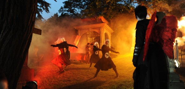 Von Anfang an ist man fasziniert vom morbiden Charme des Friedhofs, die Zuschauertribüne gibt den Blick frei auf Gräber, riesige Särge, Kunstnebel beherrscht die gruselige Szenerie, die bei Dunkelheit noch um einiges schrecklicher wird. Die Glocke vom Friedhof läutet und es geht los! Wir sehen Eurydikes Beerdigung, angelegt als großes Fest, als Dance- Event. Die Damen und Herren der Tanzcompany des GHT Görlitz- Zittau sind furchterregend gekleidet, schwarz mit langen blonden Haaren.