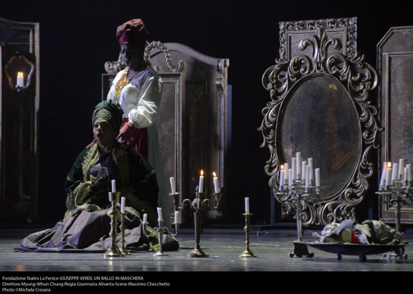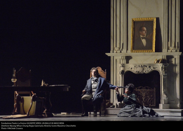 Nein, es geht nicht allein um „gran‘ passioni“, auch wenn die Sänger der Neuproduktion alles tun, um diese großen Leidenschaften unverstellt zu präsentieren. Francesco Melis Riccardo ist ein präpotenter, in seiner ganzen überzeugenden Stimmschönheit guter Tenor der alten Schule, dessen souveräne Beherrschung des „Materials“ im Grunde nicht darüber hinwegtäuscht, dass hier eine psychologisch tiefe Darstellung dieses interessanten monomanen Charakters kaum vorliegt. Ähnliches kann man auch vom Orchester behaupten: Myung Whun-Chung dirigiert einen expressiven, ja expressionistischen „Maskenball“, dem alle Piano-Nuancen abgehen, woran sicher nicht die erstaunlich offene Akustik des Hauses schuld ist, die den ersten Auftritt des Riccardo – vorn links an der Seite – ungeheuer wuchtig macht. Trotzdem macht es Spaß, aufs Orchester (und auf den von Claudio Marino Moretti einstudierten Chor des Fenice) zu hören, das die satirischen Elemente zumal der Verschwörermusik herzhaft bringt – und das vergleichslose Liebesgeständnis des 2. und die hochdramatische Verschwörerszene klingen im Fenice schier überwältigend.