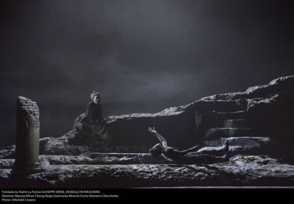 Renato ist in Sommas amerikanischer Fassung, auf der Bühne, die Massimo Checchetto bildhaft und prägnant entwarf, übrigens ein Kreole, also auch einer der „Anderen“; dass der gute Demokrat, also Richard, ihn zu seinem besten Freund ernennt, ist in zweierlei Sinn bedeutend, und dass Amelia als Schwarze am Galgenberg, im höchst dramatischen Dunkel und im Mondlicht der nächtlichen Drehbühne, besondere Ängste entwickelt: dies ist nachvollziehbar. So nachvollziehbar wie ihr Gebet auf der Spitze des Felsens, an dem der Tote dieser finsteren Nacht liegt. Orrore… War es derselbe, der zu Beginn der Oper die Treppe des (Weißen?) Hauses wischte, auf der er für die Konservativen Platz machen musste? Auf jeden Fall war es der Schwarze, der am Ende des Ulrica-Akts seine von bösen Dämonen (und amerikanischen Männern) gepeinigte Frau dank der Hilfe eines weniger konservativen und gewalttätigen Volksvertreters unbeschadet, d.h.: unvergewaltigt nach Hause nehmen konnte.