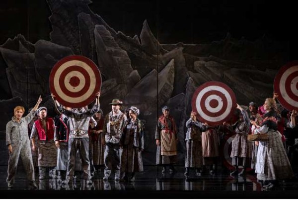 Zum Finale allerdings gibt der Regisseur sein Verwirrspiel aus Nationalitäten und Geschichtsepochen auf. Nun ist alles so, wie es zu „Wilhelm Tell“ gehört. Sogar das Opernhaus, dass diese Inszenierung zeigt, ist ein wunderschönes Stückchen Schweiz. Der schwarze Himmel über der Szene wird endlich, wie draußen, strahlendblau, die schiefergrauen schroffen Felsen werden zu anmutig schneebedeckten Gipfeln, wie man sie schon auf dem Hinflug mit gebührendem Respekt bestaunen konnte (Bühnenbild von Raimund Bauer). Wieder angetan mit den schönen roten Dekoren ihrer schlichten Tracht (Kostüme: Marie-Jeanne Lecca), die für sie immer auch ein Wams ist, singen die Bühnen-Schweizer ihre Jubel-Ode auf die gewonnene Freiheit. In geschlossenen Reihen stehen sie da, glücklich und selbstbewusst. Es gibt nichts und niemanden mehr, was dieses Schweizer Postkarten-Idyll stören könnte. Der merkwürdig ausschauende Cellist ist längst unbemerkt von der Bühne verschwunden. Die große Kunst dieser Inszenierung von David Pountnam besteht nämlich darin, etwas Vorhandenes durch etwas Fehlendes zu hinterfragen.