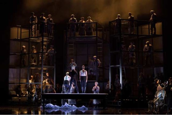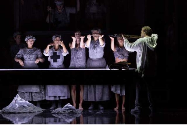 Während Schillers Tell hier also, rein theoretisch, eine Art Vorläufer von Ian Flemings ironisch überzeichnetem Geheimagenten ist, wird ausgerechnet der Bösewicht Gessler, ungeachtet seiner filmreifen Verkleidung, sichtbar als tatsächlicher Mensch. Pountney gelingt dieser bemerkenswerte Effekt, indem er den dritten Akt in einer Situation spielen lässt, die nicht mehr freie Natur, sondern beengte Gefangenschaft impliziert. Gleich zu Beginn wird tänzerisch erschütternd deutlich, welch entsetzlichen Martern die hinter hohen Mauern Internierten von den Besatzern ausgesetzt sind, insbesondere die Frauen, wie sie zu körperlichen und psychischen Wracks werden. An ihren Kleidern tragen die Bühnen-Schweizer nunmehr unübersehbar ein schwarzes Kreuz – sie sind buchstäblich Gezeichnete. Als Tell vor dem alles entscheidenden Apfelschuss räsonniert und dies vom Cello elegisch untermalt wird, befindet sich der Cellist wieder auf der Szenerie. Zwar nicht „Fiddler on the Roof“, doch hoch oben sitzend in der Gefängnisgalerie, legt er abermals, aufgrund seiner Kleidung und Ähnlichkeit mit bei Chagall auftauchenden Motiven („Musiker mit Violine“ von 1919 oder „Die Hochzeit“ von 1944) dennoch die mit jenem Musical über das „Schtetl“ verbundenen Assoziationen nahe. Wie hier die Bühnen-Schweizer, werden seine Nachfahren ähnlichen Schikanen ausgesetzt sein. Und die Schergen, die sich an ihrem Leiden ergötzen, sind Menschen wie Gessler. Sie sind nicht das abstrakte Böse, sondern sadistische, im Grunde ihrer Seele ausgesprochen schwache Charaktere.