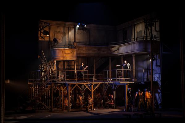 das Theater in Luxemburg präsentiert in seinem Spielplan Gastspiele von oder Koproduktionen mit Opernhäusern aus den Nachbarländern Deutschland, Frankreich und den Niederlanden und lebt so den europäischen Gedanken im Kulturbereich. So war am gestrigen Samstag im Grand Théâtre de Luxembourg eine Produktion von Verdis „Trovatore“ vor ausverkauftem Haus zu erleben, die im Januar bereits im französischen Lille zu sehen war und im Juni in Caen in der Normandie erneut auf die Bühne kommt – jeweils mit den gleichen Künstlern. Der französische Regisseur Richard Brunel hat sich für eine moderne Lesart des Publikumsmagneten ohne mittelalterliches spanisches Gewand entschieden. Er verlegt die Geschichte um die rivalisierenden Brüder, die nicht um die Identität des anderen wissen, ins Hier und Jetzt und zeigt einen Bandenkrieg im Hinterhofmilieu. Die Drehbühne von Bruno de Lavenère ist eine trostlose Szenerie mit Basketballkorb und eine an sepiafarbene Fotografien erinnernde Ruine eines klassizistisch anmutenden Theaterraumes. Die düstere Geschichte wird ebenso düster von Laurent Castaignat in wenig Licht getaucht, Thibault Vancraenenbroeck steckt die Protagonisten in passende Streetwear im Gangsta-Style oder in Wrestler-Kostüme.