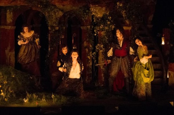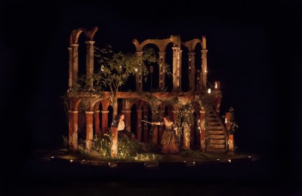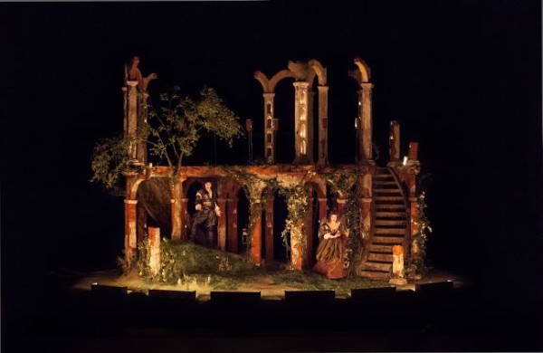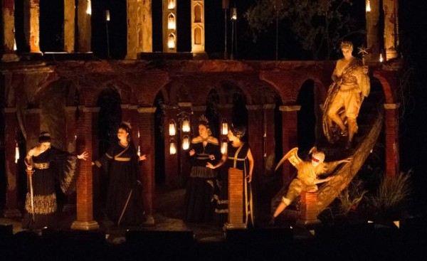 Die drei Personal- und Handlungsebenen werden in Benjamin Lazars Inszenierung im Bühnenbild (Adeline Caron) und in den Kostümen (Alain Blanchot) klar abgebildet. Leider nur die halbe Bühnenbreite nimmt in der Mitte eine idyllische runde römische Ruine mit zwei Etagen von aus Ziegelstein gemauerten Fensterbögen ein. Dieses exquisite mit viel Liebe zum Detail ausgearbeitete Einheitsbühnenbild ist wohl für eine kleinere Bühne als die des Grand Théâtre konzipiert. Zwei Treppen führen nach oben; das Ganze steht auf einem Drehteller. Die Götter agieren meist auf der oberen Etage, die Menschen darunter, die Unterweltler davor. Zusammen mit der naturalistisch abgebildeten Vegetation, die schon von der Ruine Besitz ergriffen hat, werden so die Hauptspielorte der Handlung, vor allem Hain und Palast glaubhaft gemacht. Barock-Retro total hat Lazar in Szene gesetzt: eine nächtliche Opernaufführung mit Kerzenbeleuchtung (und ganz dezenter indirekter Beleuchtung: Christophe Naillet, Licht). Nicht immer leicht erkennbar treten die Figuren in ihren prachtvollen Gewändern aus dem Ganzdunkel von hinten ins Halbdunkel nach vorne. Oben ist es kaum heller, aber die Götter sind in Weiß gewandet und besser zu sehen und zu erkennen. Über zweieinhalb Stunden Spielzeit im Schummerlicht ist für heutige Verhältnisse ungewöhnlich. Ungewöhnlich sind auch die durchgängig angewandte Bewegungsregie sowie Gestik und Mimik, die ebenfalls gewollt historisierend in Anlehnung an das antike Theater erfolgen und eher der tragédie lyrique entsprechen als einem dramma musicale. Spontaneität und Ausdruckskraft erreichen die Darsteller durch diese manierierte Stilistik in Bewegung und Gestik nicht. Mit fundamentalistischer Konsequenz werden diese Regieprinzipien durchgehalten, wodurch eine gewisse Statik und ein Eindruck von Länge entstehen. Der Stoff wird ernster genommen, als er eigentlich ist; Parodie und Humor, ironische Distanzierungen werden vermisst – wie auch pastorale Heiterkeit. Selbst die eigenartige Figur der Dema, Amme und Kupplerin, agiert in steifem Ernst. Es verbleibt der Eindruck einer „musikwissenschaftlich historisch informierten Inszenierungspraxis“, die wohl Interesse, aber weniger Empathie erregen kann.