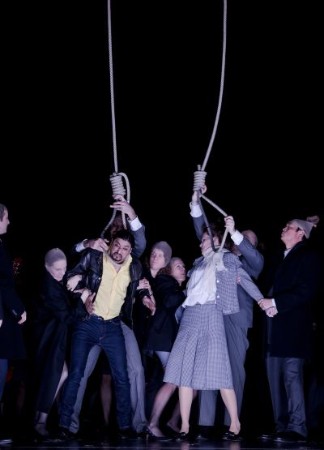 Wieder einmal eine Glanzleistung ist Peter Konwitschny zu bescheinigen. „Abends am Fluss“, das er im neuen Marguerre-Saal in Szene setzt, gerät zu hochpolitischem Musiktheater. Das stark assoziative, dem Zuschauer viel Raum für eigene Betrachtungen einräumende Geschichtspanorama, das er und sein Bühnen- und Kostümbildner Helmut Brade so hochkarätig vor den Augen des Auditoriums ausbreiten, ist ein hinreißendes, atemberaubendes, handwerklich brillant gearbeitetes Konglomerat von kurzweiligen, ernsten und heiteren, erzählenden und belehrenden Elementen von enormem geistig-innovativem Gehalt. Es ist ein sehr vielschichtiger Streifzug durch die Historie der Deutschen, den Konwitschny hier unter Einbeziehung des Zuschauerraumes – Brecht lässt grüßen – unternimmt, um das Publikum mit eindringlichen Bildern – der aus dem Strom aufsteigende Soldatenfriedhof ist nur eines davon – zu Reflexionen über die deutsche Geschichte, ihre Vergangenheit und Gegenwart sowie über die latent im Raum stehende Schuldfrage anzuregen. Es geht um den Konflikt zwischen Ost und West, um den Mauerbau und die Wiedervereinigung. Insbesondere der heimlichen Hauptfigur des Greises, die einmal modernen Soldatenlook trägt, ein anderes Mal aber in einer Uniform des Kaiserreichs auftritt und am Ende im Rollstuhl landet, kommt hier als verlässlichem Zeitzeugen mehrerer Ären große Bedeutung zu. Mit seinen Augen sehen wir nicht nur den vom Chor gebildeten Fluss, dessen Wogen durch ständiges Auf- und Niederfahren von Podien versinnbildlicht werden, sondern auch das DDR-Kaufhaus „Paradies“ und eine den 1960ern entlehnte bürgerliche Küche.