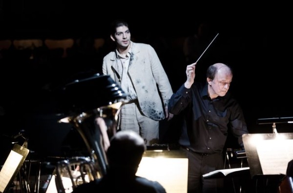 Die Hauptrolle spielte an diesem überaus gelungenen Abend aber die Musik von Johannes Harneit, der auch selbst am Pult des trefflich disponierten Philharmonischen Orchester Heidelberg stand und mit einem sehr aufwühlenden, spannungsgeladenen Dirigat beglückte. Seine Klangsprache ist gleichermaßen packend und energisch, erstaunlich und irritierend, fesselnd und stark unter die Haut gehend. Er hat in erster Linie der Moderne verpflichtete Partituren geschrieben, die indes auch einige „normale“ Töne enthalten. Was insbesondere ungewöhnlich erschien, war die hohe Anzahl an Halbtonbrechungen. Bereits in „Abends am Fluss“ mussten die Sänger immer punktgenau die Mitte zwischen zwei Halbtönen treffen, was ihnen indes trefflich gelungen ist und wofür sie sehr zu loben sind. Dasselbe Verfahren wendete Harneit in „Hochwasser“ an, verlegte es dort aber in das Orchester. Von zwei Klavieren musste das eine ständig um einen viertel Ton tiefer als das andere spielen. Aus dieser zunächst gewöhnungsbedürftigen Vorgehensweise gewinnt Harneits Musik indes einen Großteil ihrer Kraft. Durch die Verteilung des Orchesters in „Abends am Fluss“ auf den Graben und den Rang – hier bewährte sich als Co-Dirigent Dietger Holm – entsteht ein ganz eigener Klangkosmos, in dessen Zentrum der Zuschauer sitzt und von der von vorne und hinten, gleichsam im schönsten Stereoton, auf ihn einströmenden Macht und Intensität der Töne bis aufs Mark getroffen wird. Dadurch kommt es zu einer enormen Intensivierung der motivischen Detailarbeit und der Transparenz des Klangs. Harneits Musik lädt dazu ein, nein, sie fordert, sich ihr voll und ganz hinzugeben und sie in ihrer ganzen Vielschichtigkeit begierig in sich aufzusaugen. Das gilt auch für die Musik im „Hochwasser“, die – wie bereits erwähnt – aufgrund der reduzierten Orchesterbesetzung einen kammermusikalischen Anstrich aufweist, dennoch aber sehr ausdrucksvoll erscheint.