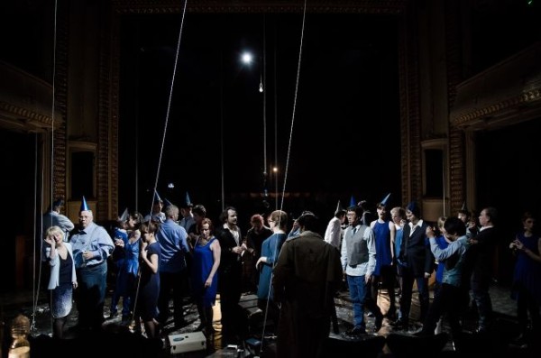 Nicht minder überzeugend geriet seine Interpretation des „Hochwassers“, zu dem man in den Alten Saal des Heidelberger Theaters wechselte, dessen intimer Charakter der kammermusikalischen Prägung der Oper – dazu später – bestens entspricht. Die Besucher sitzen auf zwei entgegengesetzten Seiten des Raumes, unter ihnen jeweils ganz hinten in der Mitte die Sänger der beiden Koffer, jeder auf seiner Seite. In der Mitte befinden sich das Orchester und die schmale Bühne, auf der der leichte Koffer auf dem schweren liegt. In diesem Ambiente rückt Konwitschny den Dialog der beiden Koffer, deren Darsteller ihren Platz irgendwann einmal verlassen und sich auf der Bühne treffen, auf eine abgehobene, dem Absurden Theater verpflichtete Metaebene, für die Beckett Pate gestanden haben dürfte. Die Höhepunkte des „Hochwassers“ bildeten das Erscheinen der schönen Frau in Gestalt der Bratschistin Marianne Venzago, die sich ein elegantes Kleid aus dem schweren Koffer holt, und das schlussendliche Eindringen des Wassers in Gestalt des blau eingekleideten und mit Spitzhüten versehenen Chors in den Raum – ein recht amüsanter Moment, derer es in dieser Produktion einige gab. Klar ersichtlich wurde, dass hier allgemeine Fragen humaner Existenz abgehandelt werden. Und wenn sich gegen Schluss auf einmal die Hintergrundwand öffnet und den Blick auf die Marguerre-Bühne freigibt, offenbart sich, dass bei allem Gegenwartsbezug des Gezeigten alles doch nur Theater ist – allerdings auf höchstem Niveau.