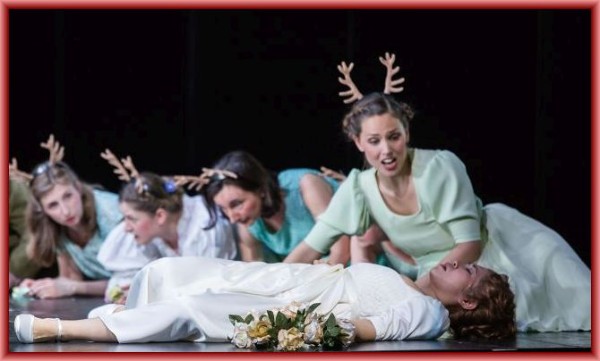 Im Programmheft der neuen Heidelberger Freischütz-Produktion ist zu lesen, „diese Oper sei einfach nur schön und geradezu der Inbegriff deutscher Gemütlichkeit“. Unter dieser Voraussetzung kann man nur schwer nachvollziehen, warum der „Freischütz“ heutzutage noch aufgeführt gehört. Die Zeiten haben sich geändert, heute werden andere Anforderungen an eine gelungene Inszenierung gestellt. Demgemäß misstraut Regisseurin Sandra Leupold dieser Aussage auch rigoros und erklärt sie demgemäß auch umgehend als „noch falscher als früher auch schon“. Gar keine Frage, dass sie damit recht hat. Konsequenterweise bewegt sich ihre Regiearbeit auch nicht in ausgetretenen konventionellen Pfaden, sondern wartet mit einer geschickten Modernisierung auf.