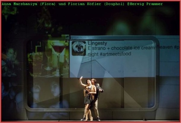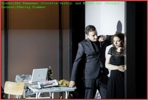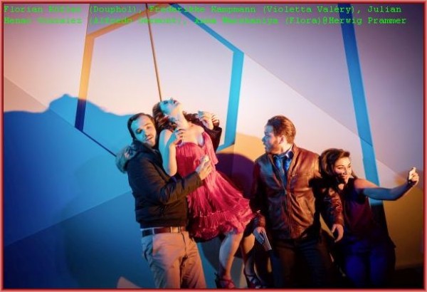 Und jeder Augenblick im kurzen Leben des Partygirls Violetta Valéry wird nun damit verbracht, im Minutentakt nach neuen SMS, Twitter-Tweets, WhatsApp-Nachrichten oder Facebook-Updates zu schauen, „Likes“ zu vergeben oder Selfies zu schießen. Und auch das reduzierte Personal dieser Fassung, die Gebrüder Alfredo und Giorgio Germont und Flora tragen ihre Smartphones wie Waffen „schussbereit“ mit sich. Was für eine erschreckende Abbildung der alltäglichen Realität!. In groben Zügen folgt die Handlung der Vorlage von Verdi, Vater Giorgio wird aber in dieser Fassung zum Bruder von Alfredo. Die nunmehr zur biederen Hausfrau gewandelten Violetta hält er das von ihr verursachte Familienunheil in Zeitungsartikeln vor Augen, die sie als „Politfamilie“ zerstörende „Drogenhure“ diffamieren. Alfredo „bezahlt“ Violetta handgreiflich für die erlittene Trennung, indem er sie zusammenschlägt, was in weiterer Folge den Verlauf ihrer unheilsamen Krankheit bis zum letalen Ende nur beschleunigt.