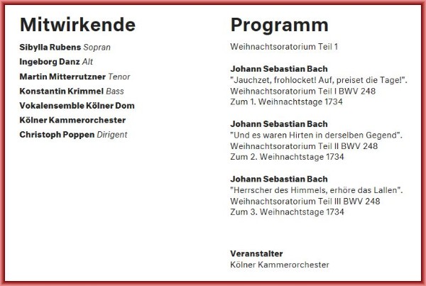Für das „Weihnachtsoratorium“ mußte das KKO natürlich durch Gäste aufgestockt werden. Für die glanzlichternden Chöre sind immerhin drei Trompeten erforderlich (Bruno Feldkircher kam aus dem Gürzenich-Orchester). Die Sinfonia wiederum erfordert vier Englischhörner. Auch hier kam Aushilfe aus dem Gürzenich. Bach, ein wahrhaft fantasievoller Klangkonstrukteur.