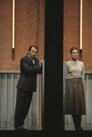 In der Günter-Krämer-Inszenierung an der Deutschen Oper in den Achtzigern war die Wolga nicht nur in der Musik Janáčeks, sondern auch im Bühnengeschehen präsent, Handlungszeit und -ort waren die des vorrevolutionären Russland. Die Kostüme waren an Aussagekraft nicht zu überbieten, so wenn Katja vor der Abreise des Gatten das weiße Jungmädchenkleid zugunsten eines schwarzen Burnus ablegen, die langen blonden Haare verhüllen muss. Während der Schillertheaterzeit der Staatsoper inszenierte Andrea Breth eine „Katja Kabanowa“, in der die Wolga zu Badewanne und Goldfischglas und einem kümmerlichen Rinnsal quer durch das Armeleutequartier geschrumpft, die Kostüme wenig aussagekräftig waren, alles im Irgendwann und Irgendwo des 20. Jahrhunderts zu spielen schien. Nun hat sich auch die Komische Oper des Meisterwerks nach dem Schauspiel von Ostrowski mit dem Titel „Das Gewitter“ angenommen, gesungen wird in tschechischer Sprache, obwohl es eine sehr gute Übersetzung von Max Brod gibt, aber gerade bei Janáček bilden Sprache und Musik eine untrennbare Einheit.