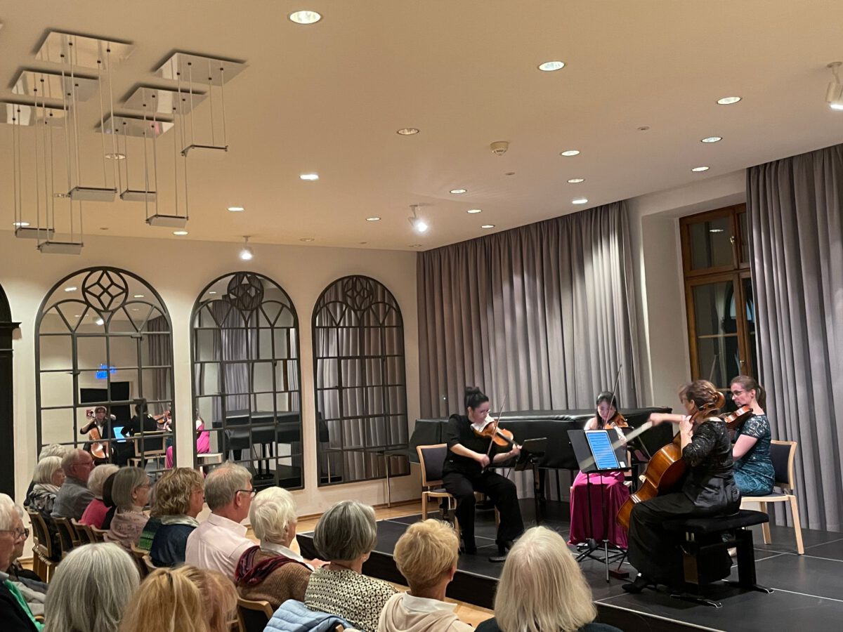 Das Streichquartett op. 29 Divorce von Fazil Say beginnt energisch, wild unisono. Starker Rhythmus solistische Einwürfe – mit großer dynamischer Tiefe, dann Flageolett, Pzizzicato, kleine Glissandi, Soli in höchsten Höhen, höchst lebendigen Taktwechseln interpretierte das Quartett dieses aufregende Stück. Im Adagio Flageolett-Glissandi zu geheimnisvollen Ostinato Terzen der Bratsche unter einem Lied der 1. Violine. Er schreibt selbst dazu, dass er Trennung und Scheidung in die Sprache der Musik übertragen wollte. Es sei ein Werk seiner Intuition. Im letzten Satz Presto klingen erregte Musikfetzen wie Argumente, Streitgespräche und Hass. Hoch emotionale Abbrüche werfen offensichtlich unlösbare Fragen auf. Unisono-Motive zerbrechen und zersplittern. Dass der unbequeme Komponist seine Emotionen immer wieder in Musik umgesetzt hat und z.B. die Proteste im Gezi Park zu Istanbul vor Jahren bei ihm zu Kompositionen geworden sind, erläuterte die in Istanbul geborene, armenische Cellistin Karolin Knoll. Sie berichtete, dass er sich auch politisch zur Menschenrechtssituation in der Türkei geäußert und die Verurteilung auf Bewährung in Kauf genommen hat. Das Studium in Düsseldorf hat er mit vierzehn Jahren begonnen und sie erzählte, wie er als Student zu Improvisation angehalten und darüber zur Komposition gekommen war. Später studierte er in Berlin und spielt als Panist heute weltweit in den bedeutendsten Konzertsälen. Mit solch anregenden Moderationen der Musikerinnen und ebenso aufregender Musik ging der erste Teil des Konzertes (musikalische Heimat) zu Ende.