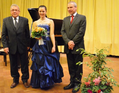 Nach dem ersten Teil des Konzertes ging es hochoffiziell zu. Der Vorsitzende der Deutschen Johann Strauss Gesellschaft Dr. Ingolf Roßberg, überreichte, zusammen mit dem stellvertretenden Vorsitzenden Albrecht Tauer, die Urkunde über das Stipendium 2013 an die junge Pianistin. Neben einem Blumenstrauß überreichte er an die Stipendiatin auch die Ehrennadel der Deutschen Johann Strauss Gesellschaft. Nicht ganz ohne Hintergedanken, denn er gab damit der Hoffnung Ausdruck, dass Nina Scheidmantel, wenn sie – und davon waren alle Zuhörer überzeugt – eine ganz Große in ihrem Metier geworden ist, noch einmal ein Konzert bei der Deutschen Johann Strauss Gesellschaft geben wird.