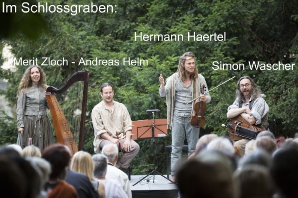 Nach dem Einzug der englischen Wandertheatergruppe wird das in acht Gruppen aufgeteilte Publikum (insgesamt wohl rund 600 Menschen) durch das Schloss zu den einzelnen Stationen des Spektakels geleitet. Die ausgeklügelte Logistik bewährte sich: die acht Gruppen wurden – von charmanten Lotsen gelenkt – so geschickt an die sieben Aufführungsorte geleitet, dass alle sämtliche Programmpunkte erleben konnten. Für die Künstlerschar bedeutete dies natürlich, dass sie ihre Darbietungen mehrfach präsentieren musste. Meine Gruppe wurde nach der Eröffnung im Schlosshof zunächst in den Schlossgraben geführt. Da erwartete uns in einer englischen Hafentaverne des 17.Jahrhunderts nicht nur stilgerecht ein Buffet mit Lobscouse und Hartkeks (Rezepte im Programmheft!) samt Getränken, sondern auch eine Musikantenschar (Geige, Blockflöten, Harfe, Drehleier und Stimme) mit altenglischer Kneipenmusik. Mit köstlichen alpenländisch-englischen Ansagen gelang es sogar, das Publikum zum Mitsingen zu bewegen, selbst ein Limerick-Kanon wurde versucht.