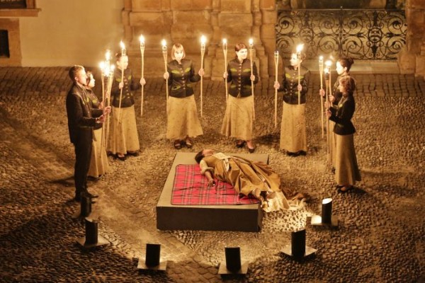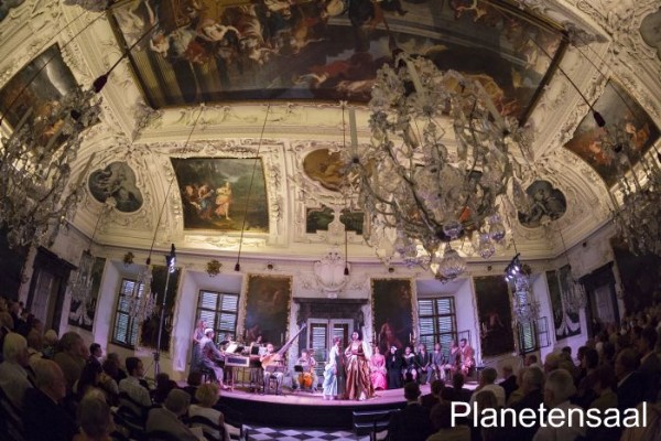 Aber bin ich mit meinem Bericht schon dem tatsächlichen Ablauf voraus. Nach dem zweiten Bild wird nämlich für unsere Zuschauergruppe die Opernaufführung unterbrochen, wir werden durch die Prunkräume des Schlosses geführt und erleben zuerst eine Lesung der epischen Versdichtung Venus und Adonis von William Shakespeare, die heute als erstes gedrucktes Werk unter dem Namen Shakespeare gilt. Und hier eine die einzige kritische Anmerkung des Abends: stilgerechter wäre es gewesen, den Text in englischer Sprache vorzutragen. Dann geht es weiter durch die Flucht der barocken Prunkräume in einen Saal, wo wir – unter kaiserlichen Portraits – Gesänge von John Dowland hören. Die Sopranistin Tanja Vogrin begleitet sich selbst auf der Harfe, unterstützt auf der Blockflöte von Andreas Böhlen. Dann kehren wir wieder in den Planetensaal zurück und erleben das Ende der Oper. Zum Epilog versammelt sich das Publikum wiederum im Schlosshof und unter den Arkaden der beiden Geschosse. Alle Lichter verlöschen, Dido wird im Kerzenlicht in der Hofmitte aufgebahrt, es erklingt altenglische Musik des Instrumentalensembles und ein Madrigal von Orlando Gibbons. Aber plötzlich gehen die Lichter wieder an, die Wandertruppe erscheint, nun in ihrer heutigen Alltagskleidung, nimmt die wieder zum Leben erweckte Dido an der Hand – und heiter führt Aeneas seine Dido aus dem Schloss hinaus, begleitet von der munteren Komödiantenschar. Großer und anhaltender Jubel des Publikums für alle Ausführenden – das Publikum strömt sichtlich und hörbar zufrieden über einen wahren Sommernachtstraum englischen barocken Musikspektakels durch den mit Fackeln erhellten Schlosspark nachhause.