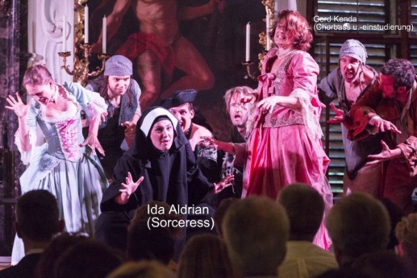 Und auch die vokale Besetzung um Dido herum ist für diesen Rahmen ebenso optimal: acht solistische Damen und Herren verkörpern nicht nur alle Solopartien, sondern auch den Chor und agieren in einer einfachen Choreographie dazu noch als Tanzensemble. Noch dazu sind alle (auch das Orchester!) in ihrer Kostümierung treffend charakterisiert. Da ist der edle Aenas (Ulfried Staber mit viril-sonorem Bassbariton), die charmante Belinda (Anna Magdalena Auzinger mit beweglichem, nie scharfem Sopran) und der markante Mezzosopran von Ida Aldrian, die sich von der bigotten Nonne überzeugend zur drastischen Zauberin wandelt. Aber auch die anderen fünf sind gleichwertige Solisten und fügen sich zu einem ausgewogenen Ensembleklang (Einstudierung: Gerd Kenda).