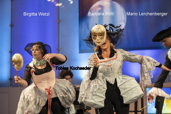 Bevor man noch den Saal betrat, hatte der Abend allerdings schon mit einem heiter-geistvollen Vorspiel im Foyer unter dem Titel Eine Nacht vor Venedig begonnen. Das Publikum war zu einem Glas Wein eingeladen und ein bestens disponiertes und spielfreudiges junges Sänger-Trio präsentierte – von einem Akkordeon begleitet -Ausschnitte aus Eine Nacht in Venedig von Johann Strauß: zunächst das eigentlich als Quartett gedachte Alles maskiert, alles maskiert – besonders reizvoll neben den großen Warntafeln Maskenpflicht bis zum Sitzplatz!