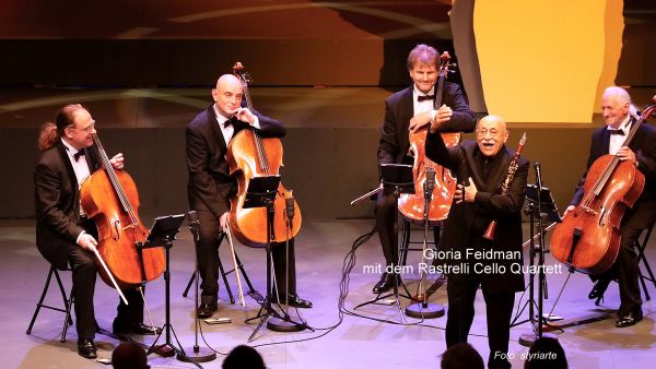 Und tatsächlich: diese vier Cellisten seien unbedingt auch namentlich genannt – sie waren großartig und auf dem selben Niveau wie der unvergleichliche Giora Feidman: Kira Kraftzoff, Misha Degtjareff, Kirll Timofeev, Sergio Drabkin – alle vier sind aus Russland bzw. Weißrussland stammende, klassisch ausgebildete, in Deutschland beheimatete konzertierende und auch unterrichtende Cellisten. Zu Recht hatte sie Giora Feidman immer in den Beifall einbezogen. Feidman ist nicht nur ein Meister seines Instruments, er versteht es auch von Beginn an, das Publikum in seinen Bann zu ziehen durch seine pianissimo beginnenden Klezmer-Paraphrasen, die dann unmerklich in die Musik des 20.Jahrhunderts übergehen. Und Feidman ist ein überaus charmanter Moderator, der durch seine überkonfessionelle Menschlichkeit berührt und dem es problemlos gelingt, etwa bei Leonard Cohens Hallelujah oder bei Sholom Secundas Donna, Donna das Publikum zum Mitsingen zu bringen. Das letzte Stück im offiziellen Programm war das vom Komponisten Béla Kovács dem Meister Giora Feldman gewidmete und zum Hit gewordene Shalom Aleichem Rov Feidman. Das informative Programmheft sei hier um einen Graz-Bezug ergänzt, der wohl auch Giora Feidman nicht bewusst ist: Der große ungarische Klarinettist und Komponist Béla Kovács war von 1989 bis zu seiner Emeritierung 2009 ein hochgeschätzter Professor an der Universität für Musik und darstellende Kunst in Graz. In dieser Zeit – nämlich im Jahre 2004 – schrieb er Shalom aleichem Rov Feidman !