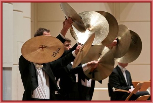 Kaum faßte das Podium die grosse Zahl der Mitglieder des WDR Sinfonieorchesters Köln. Die mehr als zehn Pauken waren hinter dem Orchester im Halbkreis aufgestellt, auf jeder Seite davor zwischen den Bläsern je eine grosse Trommel (gran cassa), die mehr als fünf Beckenpaare links und die Tuben hinten rechts. Die Bläserchöre der Fernorchester wirkten ganz von oben rechts, links und in der Mitte des obersten Rangs sowie hinter den Zuschauern.