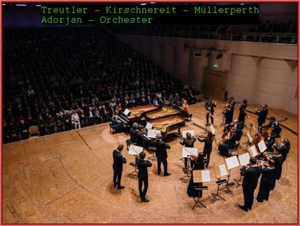 Die beiden schafften es erfolgreich, sich sowohl dem Spiel des fürsorglich begleitenden Orchester einzuordnen als auch sich gegenseitig abzustimmen. Das zeigte gleich der energische von beiden gespielte Triller, mit dem nach der Orchestereinleitung die Solopartien des ersten Satzes begannen. Wenn sie sich auch häufig vor allem in der Durchführung im Spiel abwechselten oder gegenseitig begleiteten, gab es doch immer virtuose Läufe für beide gleichzeitig, die ihnen exakt unisono gelangen. Dies galt auch für punktierte Akkorde, etwa im langsamen Satz. Dort umspielten sie einfühlsam mit girlandenartig – arpeggierten Akkorden die Melodien der Holzbläser, vor allem der Oboe. Höhepunkte waren die Kadenzen, besonders im dritten Satz, wo sie Virtuosität im Zusammenspiel beweisen konnten, oder auch zum Schluß, wo die „normalen“ Achtel der Melodie von Triolen-Achteln begleitet wurden.