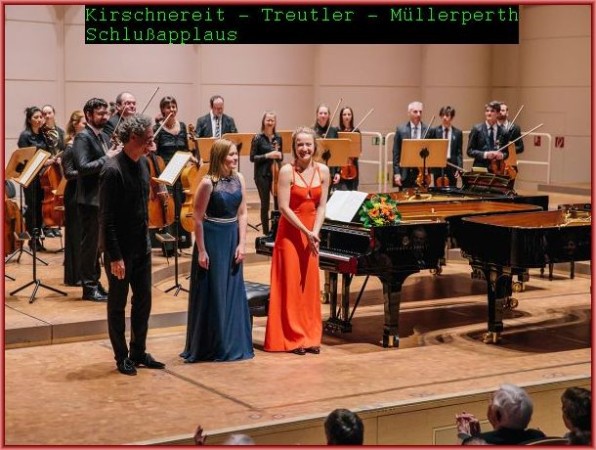 Abschliessend spielten alle drei Pianisten mit dem Orchester Mozarts Konzert für drei Klaviere und Orchester in F-Dur KV 242. Hier übernahm Matthias Kirschnereit bescheiden das dritte Klavier, dessen Partie Mozart technisch einfacher gestaltet hat. Ältere Konzertbesucher – dazu zählte die Mehrzahl – erinnerten sich wohl, daß es deshalb in den 80-er Jahren Kanzler Schmidt (dafür grosse Hochachtung!)zusammen mit Christoph Eschenbach, Justus Frantz und dem London Symphony Orchestra einspielen konnte. Auch in den beiden anderen Solo-Partien waren die Anforderungen nicht so groß wie im Konzert für zwei Klaviere.. Da Magdalena Müllerperth am ersten und Annika Treutler am zweiten Klavier jetzt auch sichtlich und hörbar gelöster wirkten, erfreute man sich am munteren abwechselnden Spiel im ersten Satz, dem etwas lyrischeren zweiten und dem tänzerischen Menuett – Tempo im dritten Satz.