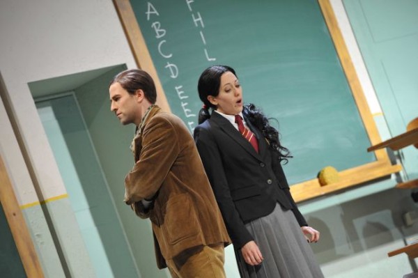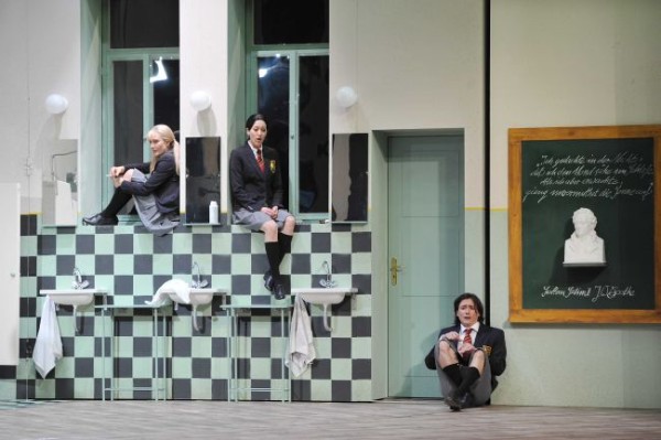 Mit Hilfe der emsig eingesetzten Drehbühne erschließt sich dem Zuschauer ein reger Querschnitt durch das Schulgebäude. Nacheinander ziehen an seinem Auge ein Klassenzimmer, ein Schlafsaal, ein Badezimmer und eine Turnhalle vorüber. Ständig präsent bleibt eine im rechten Bühnenbereich aufgehängte Goethe-Büste. Sie ziert eine Schultafel, auf die zudem mit Kreide ein Gedicht des Dichterfürsten aus dessen „Westöstlichem Diwan“ aufgeschrieben ist. Auszüge aus diesem 1819 erstmals erschienenen Gedichtzyklus, mit dem Goethe seinem persischen Kollegen Hafis seine aufrichtige Reverenz erwies, ziehen sich durch die ganze Aufführung und bilden die Grundlage des humanistisch geprägten Lehrplans von Schuldirektor Bassa Selim. Warum er sein Internat gerade „Westöstliches Collegium“ genannt hat, wird nur allzu offenkundig. Bereits vor dem Einsetzen der Ouvertüre hört man bei noch geschlossenem Vorhang, wie Selim seinen Schülern Goethes Gedicht „Gottes ist der Orient“ beibringt.